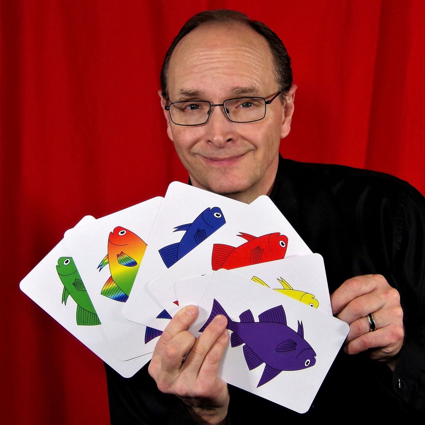 Turn the front of the cods/cards to the audience again. You pretend to take the audience out of the state of hypnosis so they will be able to see the marks. When you turn the cards around again, each and every card now has a red back with BIG BLACK letters spelling out the colored fish on the face of each card! The jaws will literally hang open. So magical.